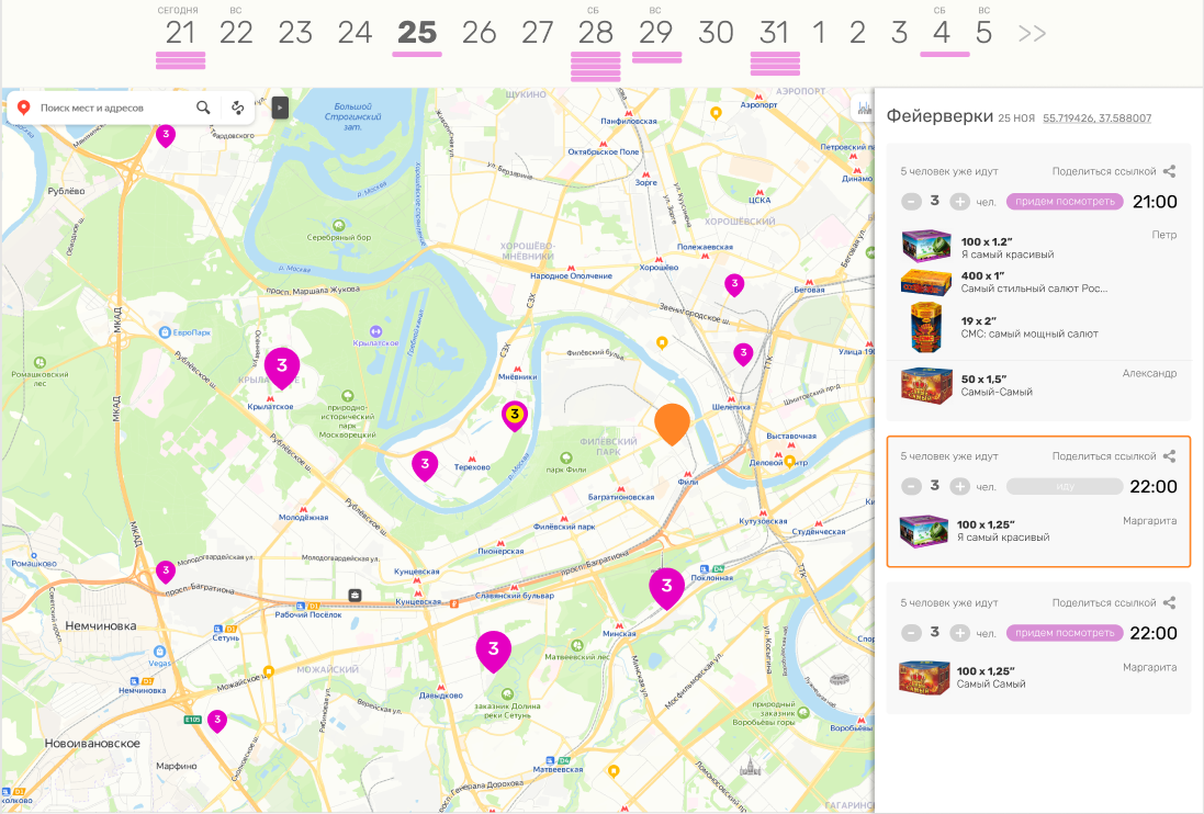 В общем, нам такая идея показалась интересной, и мы сделали нашу “Feeriya map” - Карту запусков фейерверков. На этой карте вы сможете отметить место и время где планируете запускать свои фейерверки. А другие люди могут посмотреть ближайшую дату и место, и запланировать для себя этот маленький праздник.